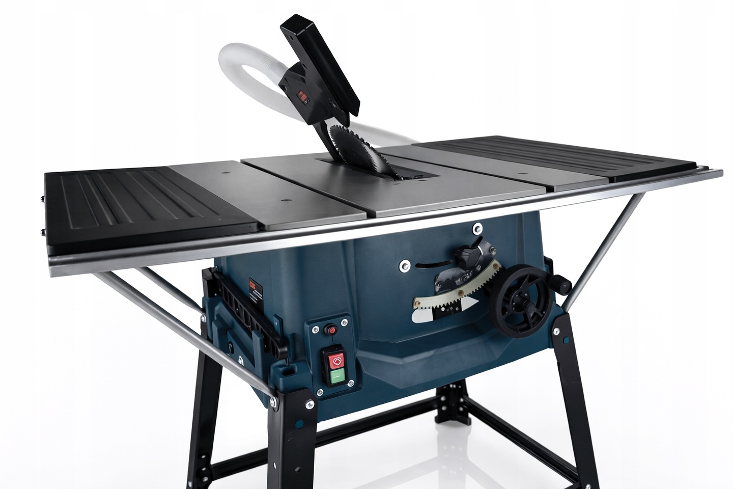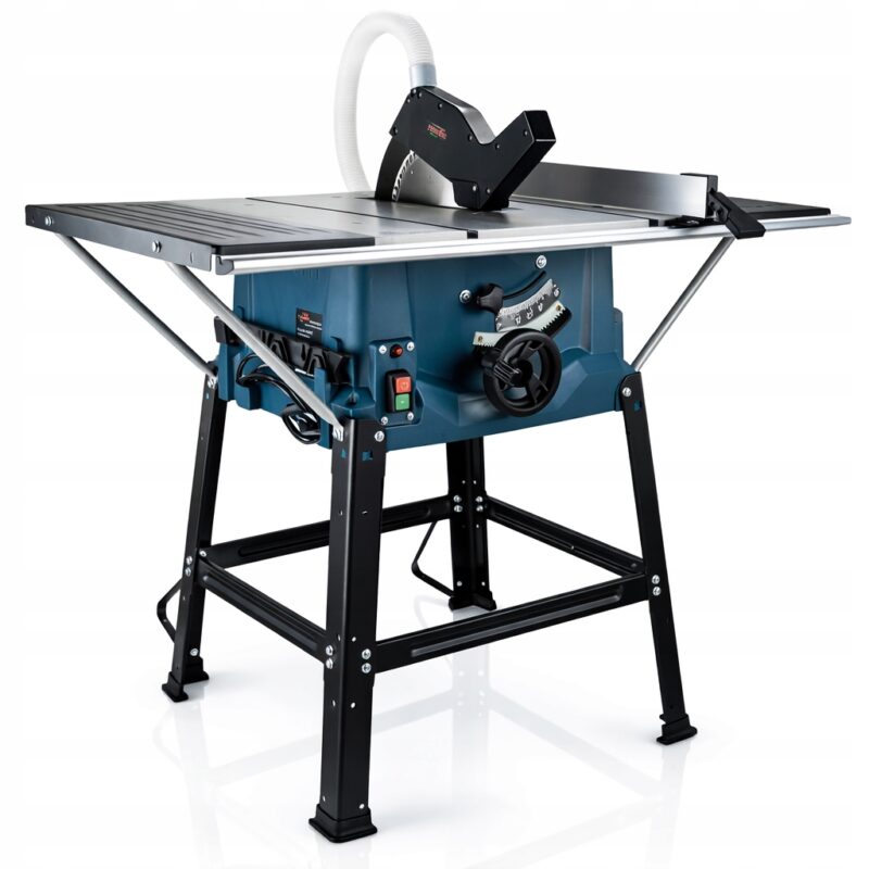 Prowadnica boczna umożliwia dokładne przecinanie desek na zadaną szerokość, a aluminiowy stół roboczy osadzony na stabilnych nogach zapewnia pełną kontrolę i bezpieczeństwo podczas pracy.